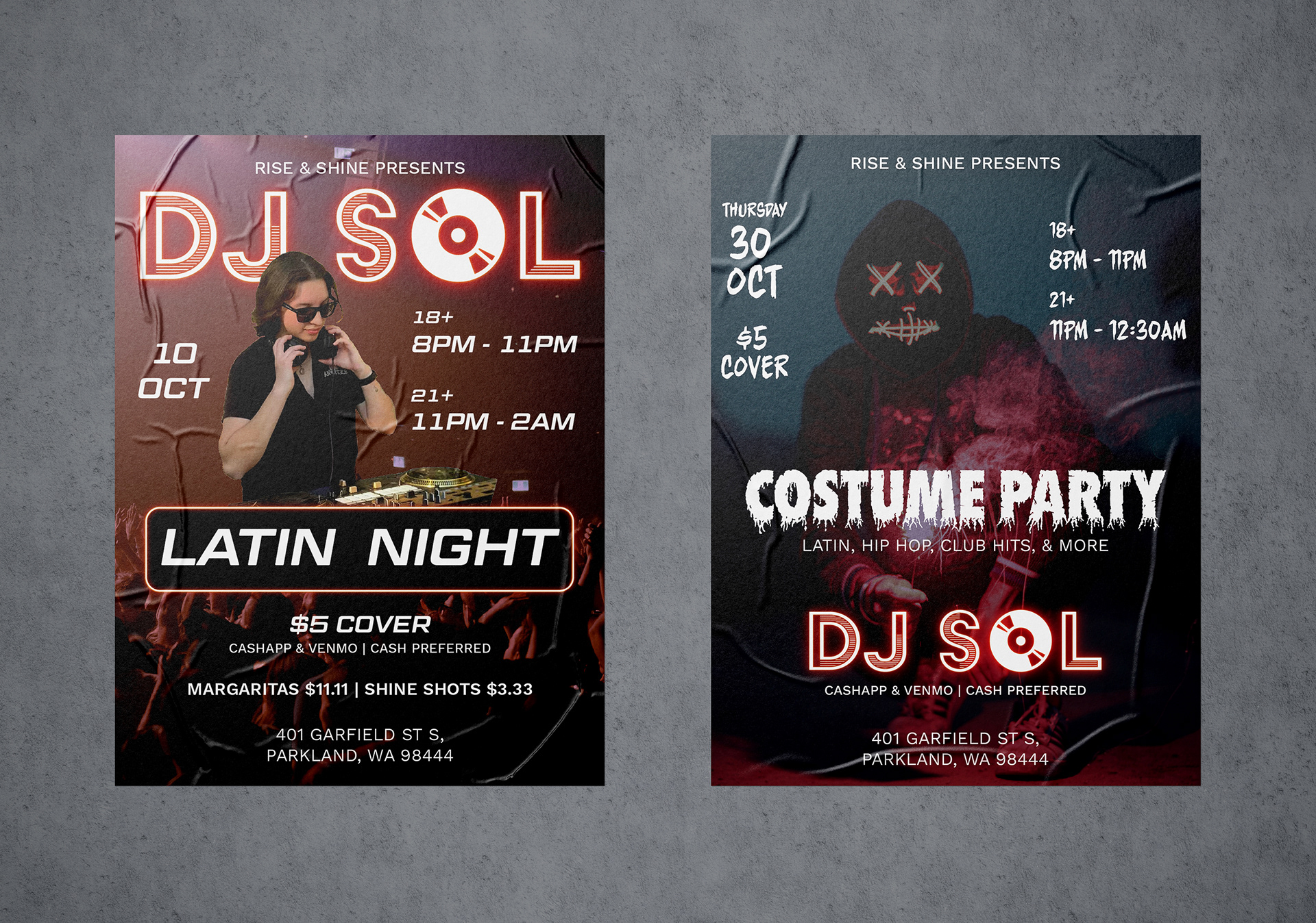 In this project, I designed several graphics and products for my ongoing client, DJ Sol. I created a cohesive brand identity seen in 10+ DJ events and designed promotional social media graphics reaching 1,000+ Instagram users for events with 60+ attendees. Deliverables include a logo, business cards, branded clothing, and promotional social media graphics.